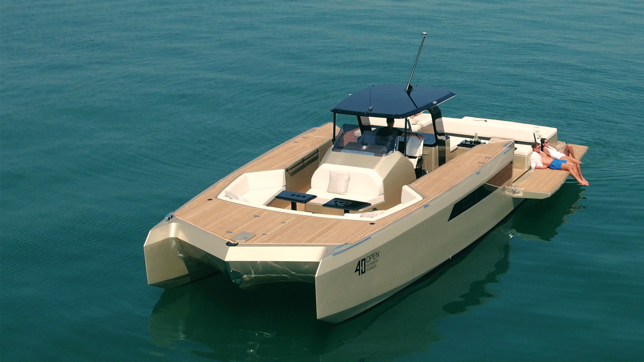 The catamaran is propelled by four 350hp Suzuki outboard motors, a solution which is becoming more and more fashionable on multihulls in the USA…