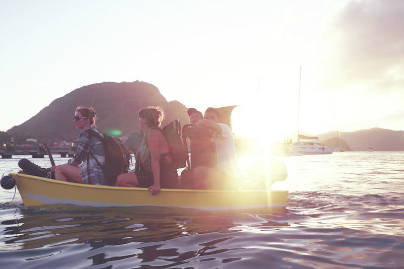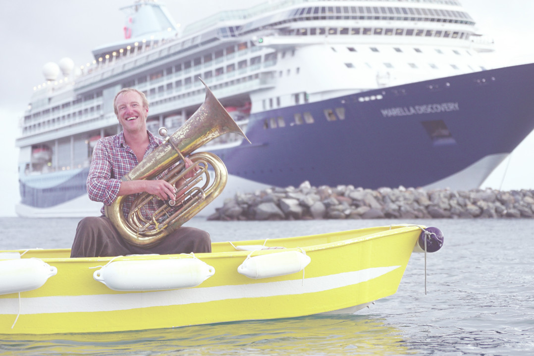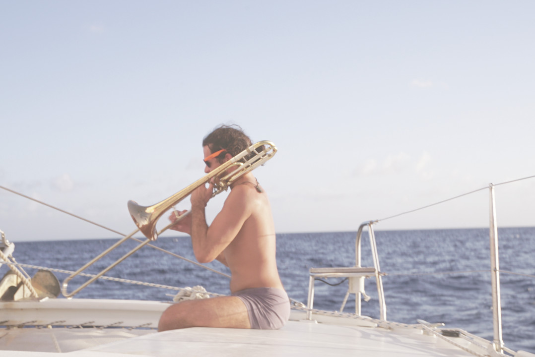 One month after having everything organized onboard, we picked up a group of musicians in Guadeloupe. One of Bot’s challenges is to find a balance in the group of musicians. What kind of concert could Honky Tonk give with four double bassists? Each group needed to have balanced rhythm and melodic sections. That winter there would be Russel on the trombone (USA), Laurin with her clarinet (Germany), Léonie on vocals and washboard (UK), Quentin on the banjo (France), Tom on the sax (Belgium), Bara on the clappers (Czech Republic) and Bots on his tuba (Belgium). Also on the team were Coline, our camerawoman, and me. I looked after the communication. Only Quentin, Coline, Bots and me, Soizic, were sailors. The others were to discover the magic of phosphorescent plankton or the moon rising from the trampoline, the stress of sail-handling in heavy weather, the joy of being followed by a pod of dolphins or a good bout of seasickness.