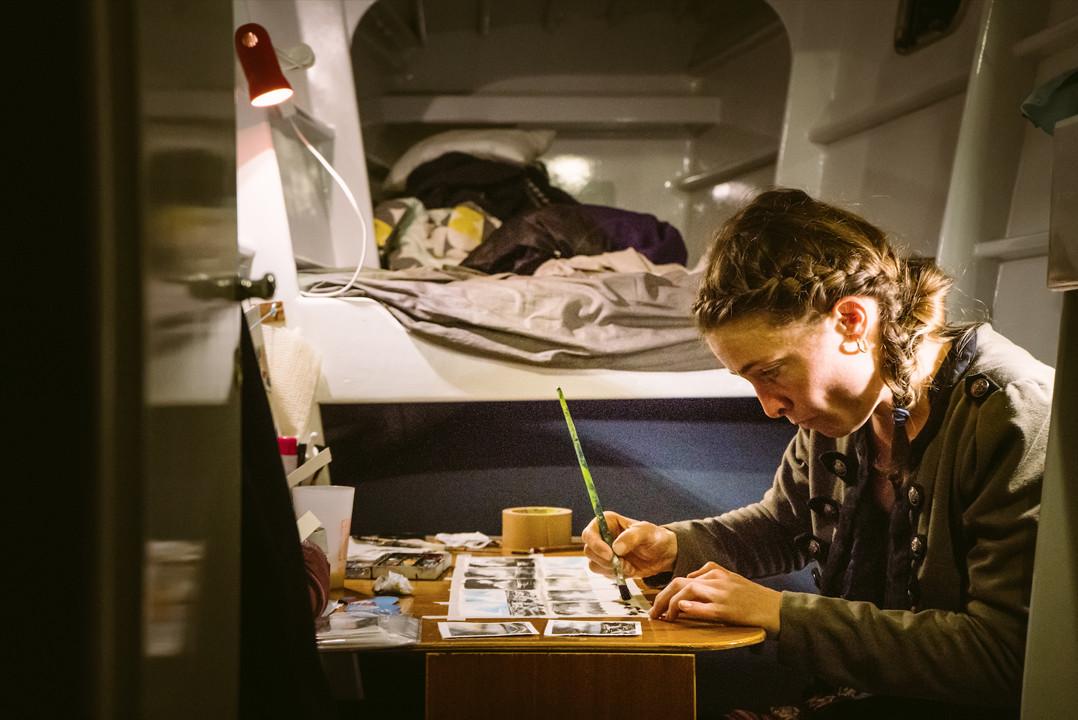 My studio is housed in the port hull. I generally work on smaller formats (unsurprisingly being on a boat) to produce watercolors and also work with Indian ink.