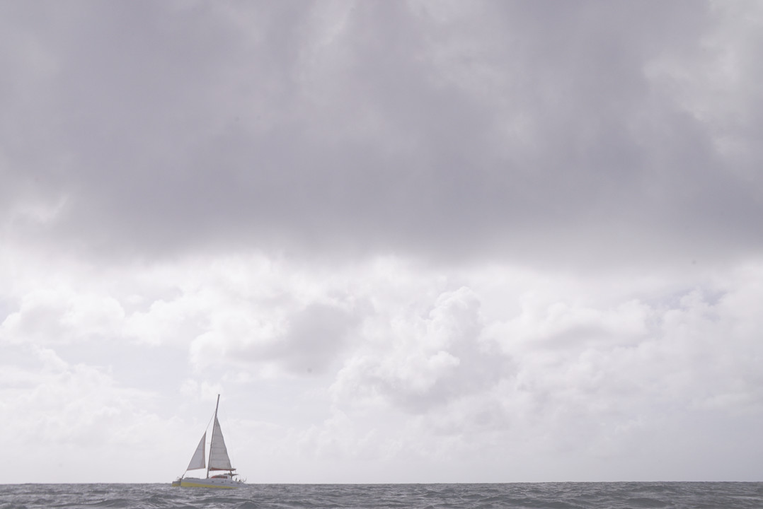 The captain got to grips with sailing the catamaran. No one on board had ever dealt with sails on a catamaran before. It’s one big experiment that’s beginning! The debate begins on board with the crew, comparing and observing the sails on neighboring multihulls, analyzing the dynamics of how the mainsail fills and flattens out, understanding what reefing is all about and discovering the anemometer, which no one had ever used before. The crew is enthusiastic and ready to learn. The conditions are ideal: a steady 15 knot, warm east-south-easterly. It’s perfect for learning maneuvers in calm conditions, and also for getting used to reading the sky. Small squalls pass through regularly, which means that the crew have to concentrate on reefing and watching. Although the sea is calm, everyone soon realizes that they need to be alert, keeping an eye on their surroundings and the clouds as though it were a pan of boiling milk. Coline, the photographer captures the idyllic setting, and the photos are used for all our publicity and communication. All of the musicians who came on board will remember the wonderful Caribbean images. It would be difficult for them to imagine themselves in a big sailing jacket and gloves. Yet this is what they’ll need for their stay in Ireland or Normandy…! That however, is a story for another day…