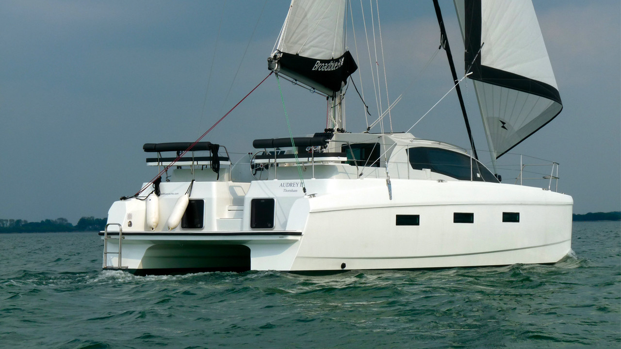 There was a time when the Brits were at the forefront of cruising catamaran production, but decades later this accolade has long since gone to the French, South Africans, Australians and others. So when a new British cat comes along, our interest is sparked. The current trend in cruising cats is bigger and bigger: many manufacturers ranges now start at 45 feet. Big is all very well, but big is expensive to buy, big is expensive to dock, big is expensive to maintain, and so is out of reach for many. Here, we have a "small" boat, yet the advert says two large double cabins, two single berths, heads with luxury shower, additional heads, large galley, large dining table and chart table in the saloon, large cockpit, and so on... Really? On a 33 footer? And all for £139,500? Surely corners have been cut, compromises made? And will it sail? We sent Graham over to the UK to see what the story is with the new Broadblue 346.