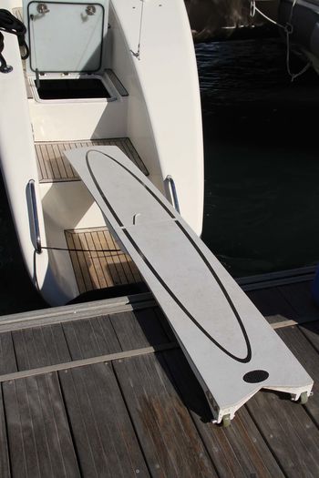Getting down onto the dock is easy with recent models that are equipped with a pivoting platform. But otherwise? You’ll need a passerelle if you’re going to be moored stern-to. Folding (or not) in carbon fiber or a simple board (slatted, if possible, to make it non-slip) - there’s something for every budget! If you are bows-to the dock, fit a ladder to your pulpit, or a cut down set of steps.