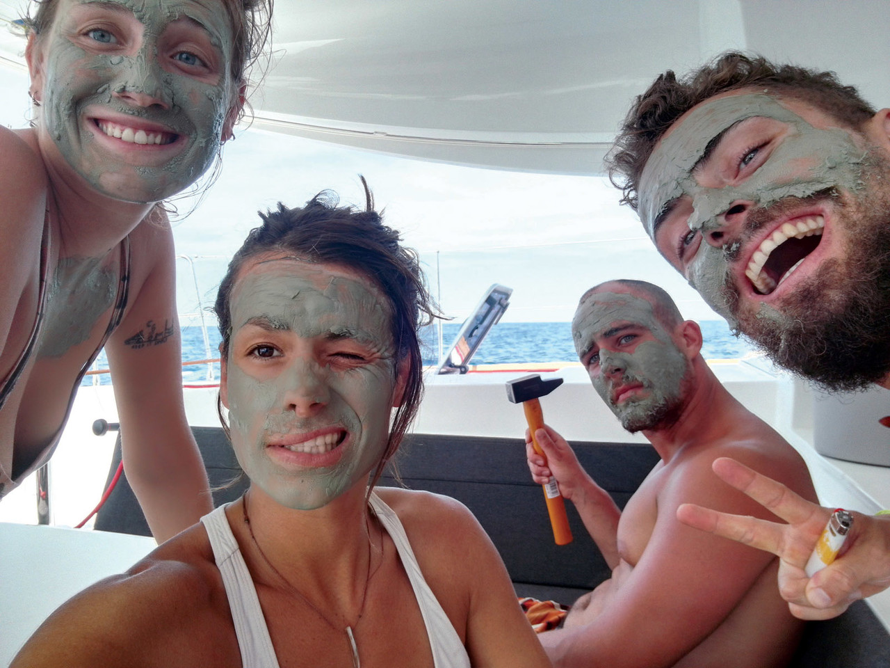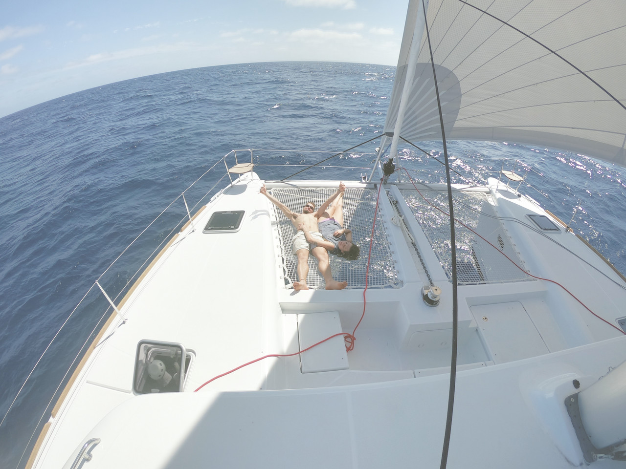 At sea, our occupations are more varied than you might think: you eat, sleep, cook, play sports, taste, admire, read, learn the knots, put the world to rights, check the weather, put the gennaker up, take the gennaker down, gybe, then gybe again, take in a reef, make rice, and start all over again. Although not necessarily in the same order... All that makes our beautiful days more pleasant. In fact, I was very apprehensive about finding myself with my father, my man and my best mates on a catamaran. There's no tougher test than life at sea to find out whether you can or cannot get on with someone. It's make or break. On board, there's no way out - apart from one of the forepeaks or even the masthead for the most reckless among us. You have no choice but to take it on the chin. Taking it upon yourself to talk as soon as you feel the slightest tension and immediately lancing the boil is for me the key to a healthy and peaceful relationship. It's a great experience. And when it works, a lifelong magical bond is formed. However, it's not easy to get through every day: with our strong and different characters, sometimes we all need to put our egos to one side.