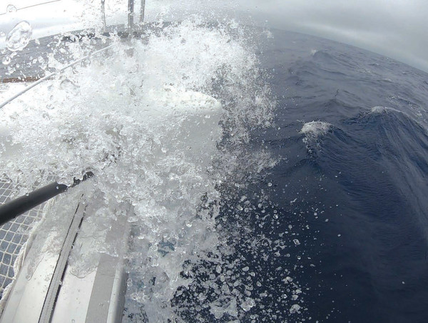 March 12 and we had just come through our second storm system. I can assure you that it was pretty hard going once again! I can still see my father facing up to each squall one by one without even thinking, but still stressed to the core because we had just spent a night without sleeping with 45/50 knots of established wind and a swell with 25- to 35-foot (8-to 10-meter) waves. To make matters worse, a huge squall came along at daybreak. When we saw this monster advancing towards us, while we were already dealing with strong gusts, we had no idea of what to expect. What was this squall going to batter us with? 70 knots, 80? A fine rain began to fall, and the mysterious squall was still visible in the distance. With my father, after that long and agitated sleepless night watching over Maitai, we looked at each other with great understanding. All we could do was to wait for the verdict and whatever punishment the weather would throw at us, without being able to do anything... Then strangely, the wind seemed to calm down and drop, a fog rose and the swell decreased, little by little... The ocean seemed to regain its calm and leave behind its raging seas. Phew!