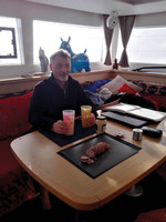 I’d rather talk about something a little more light-hearted. Let’s talk about boat food! Because that’s one area which held up pretty well, haha! The day that we got through this second depression (and yes, we were so keen to get fishing that we set the rods back up as soon as the wind dropped a little!), César reeled in a big 60 lb (25kg) tuna all by himself! In no time at all, the fish was cleaned, cut up and delicately deposited on our plates. The sashimi was wolfed down in the blink of an eye. There’s no better way to reconnect with life and the sea after two days of negotiating storms! A twist of lemon, a hint of olive oil, a turn of the pepper mill, a pinch of fleur de sel, and we had produced a meal worthy of Bocuse. What a delight! It had been a long time... The next day, Lisa made us rillettes with the rest of the tuna. Taste sensation number 2. Max, as usual, made the bread. And me, I invented the «I’ll stuff it all in» pizza pie. No need to tell you that this fine recipe was based on any ingredients or leftovers that could be unearthed on board the catamaran. And yes, on a boat, it’s very important to manage your stocks over time and to keep an eye on the maturation of the food, so that you don’t lose and spoil anything.
