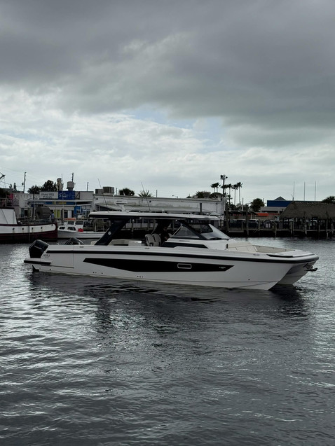 Within the Sport lineup, this new 45 sits above the 32 and the 36. As expected, the double-stepped hull and powerful engines promise excellent performance - close to 45 knots at top speed and 35 knots at cruising speed. At anchor, the emphasis is on modular living. The cockpit becomes impressively large thanks to fold-down bulwarks and a central sugarscoop, while the outdoor saloon can be transformed at will into an XXL sofa facing a screen that retracts into the transverse galley unit. Four bucket seats face the ultra-connected helm station, with full integration of Android and iOS systems. The builder has also fitted a cozy double cabin along with a fully equipped head.