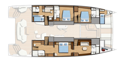 The brand has long focused on the charter market, quickly concentrating its lineup on 40- to 54-footers. More recently, Bali has strayed somewhat from this pattern with the 37-foot Catsmart and the current flagship, the 5.8. So, the announcement of the upcoming 7.0 will completely reshape the brand’s image and positioning. In this size class, uncompromising luxury is omnipresent, whether for private owner use or charter work. The Bali DNA, however, remains very much intact with the signature up-and-over door. But aboard the 7.0, this will be complemented by a large, glazed door at the front. This configuration allows for flush-decked access via the nacelle all the way to the front of the catamaran. Also in evidence is a brand-new coachroof design which is now tinted and, most notably, features highly forward-set side arches. The shipyard is offering an owner’s version that incorporates an entire hull, promising a truly impressive and private suite.