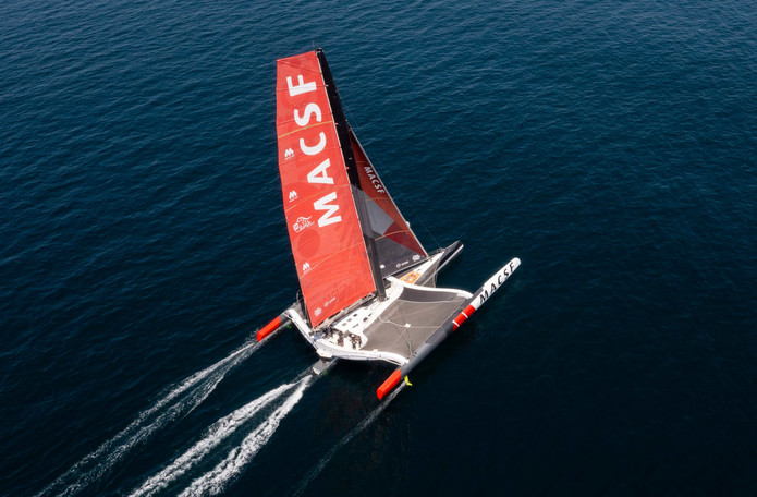 The Ultim MACSF was first launched in 2014 bearing the name Sodebo Ultim'... but this giant trimaran has much earlier origins, as it borrowed many elements such as the connecting arms and floats from Geronimo, a multihull launched 13 years previously. The trimaran continued its (very) long career under the names Actual Leader, Mieux, and finally Adagio before flying the colors of MACSF, a French insurance company for healthcare professionals founded in 1935.