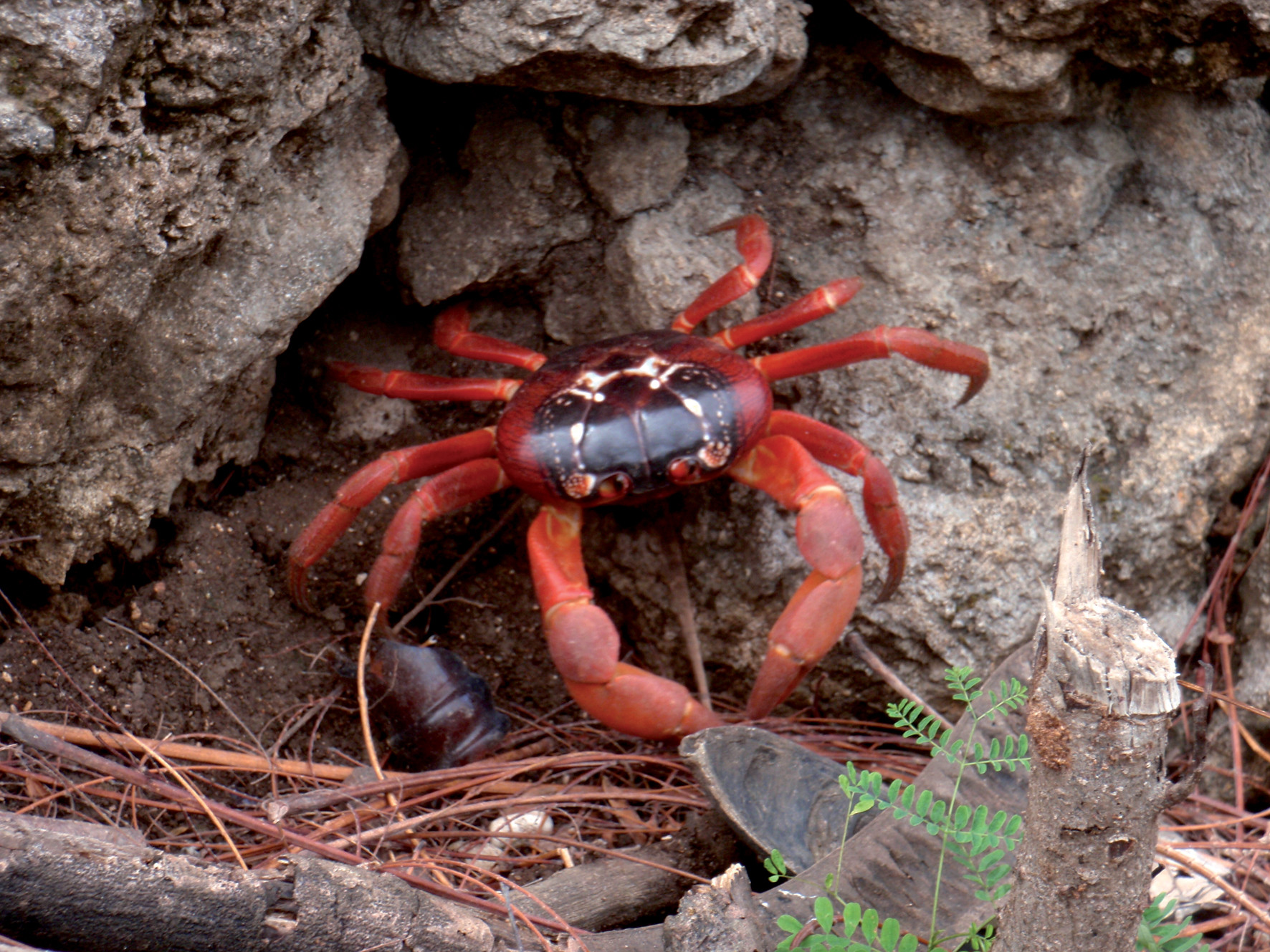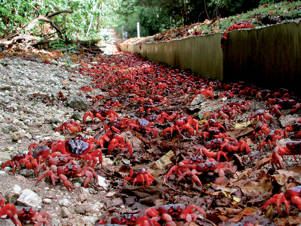 Another more amusing peculiarity about Christmas Island, are the famous red crabs! Because the island is isolated in the middle of the ocean, lots of the flora and fauna is endemic. There are millions of red crabs on the island, and during the rainy season there is an incredible movement of these animals with the aim of reproducing. Normally, they live in the undergrowth, in holes in the ground in the humid forests. They feed on leaves, fruit and snails. (There are also Coconut or "Robber" crabs on Christmas, which don't hesitate to eat their cousins alive!). These charming creatures, which are not aggressive towards man, struggle to survive in conditions which are too hot or too dry. During the dry season they hide in their burrows, covered in leaves to stay cool. So they await the start of the rainy season in October/November, to begin their incredible migration to the sea. The crab's reproduction on Christmas Island is linked to the phases of the moon. They leave their forests and head straight for the sea as soon as the first monsoon rains begin, with whole columns of them taking whichever route is possible. Gardens, schools, roads, tracks, golf courses. Nothing deters them because their instinct to reproduce is so strong. The government has installed bridges and tunnels for the red crabs to limit the carnage caused by passing vehicles. Throughout the three weeks of this amazing transhumance, the locals go nonchalantly about their business, playing golf among thousands of crabs and cutting their speed or avoiding certain roads.