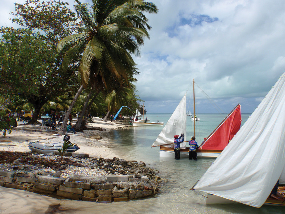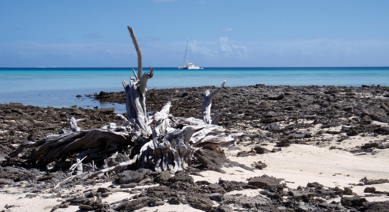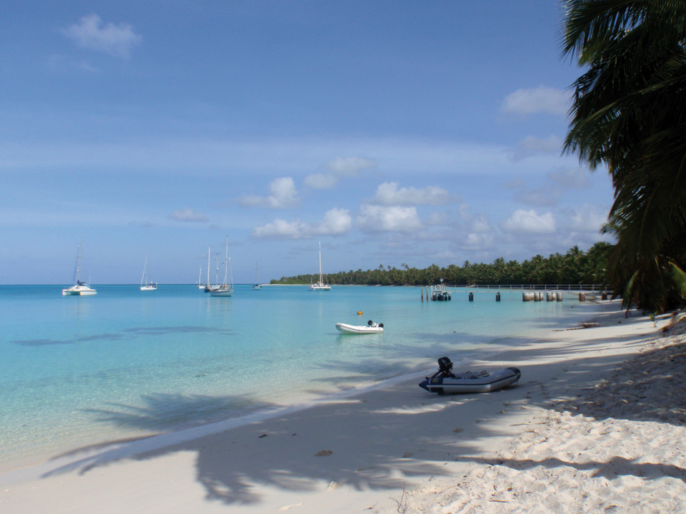 Passing boats congregate in the Direction Island anchorage. Despite this it is one of the loveliest that we have encountered on our round the world trip. 2 or 3 miles to the south is Home Island, where the administrative authorities are based, and where there is a post office, an internet service, and a grocery store with the most expensive prices that we ever saw ($10 Australian for a kilo (2lbs) of potatoes). You need to use your dinghy to get ashore. Beware of the coral which is all over the place. At first light I looked across the somber horizon for the line of coconut palms on South Cocos. I first made out Home Island, two points to port, and then Direction Island. Even in these days of electronic navigation, GPS and the Maxsea software, I still find the sight of an island emerging from the sea to be quite magical, like a recurring dream, and these are moments which I cherish. Situated 12° south of the equator, the Cocos Keelings are affected by the Indian Ocean monsoons. There is a north-west monsoon from January to May and south-east Trade Winds for the rest of the year. Since 1984 the islands have been an external Australian Territory, despite being almost 2800 kms (1,500nm) from the city of Perth on the Australian west coast, from where there is a weekly flight. There is another air route, mainly used by the population of Asian (mainly Malaysian) origin, and Europeans, which links the small atoll to Singapore. I have in front of me a map of the sea bed in this part of the Indian Ocean. You'd think that we were flying over the Alps! The two Cocos Keeling atolls formed at the summits of two former volcanoes, now submerged and which rise on average 5000 meters (16,400 feet) above the ocean floor. These two huge underwater mountains are linked under the water by a narrow base, at a depth of 7 to 800 meters (2,300 to 2,600 feet). The North Cocos Atoll, which is surrounded by an uninterrupted coral reef, is made up of just one island measuring 2 kms by 1.3km (1.25 x 0.8 miles) and only reaches an altitude of 5m above sea level. By contrast, South Cocos, 12 miles further south is a circular atoll made up of more than twenty islands enclosing a large lagoon (17km by 11km / 10.5 x 7 miles) which links to the sea through two wide passages and a number of false passages where the ocean water gets in at high tide over the reef.