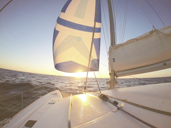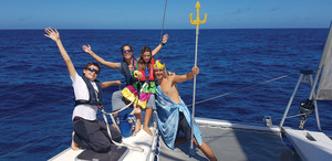 The crossing of the equator is scheduled for this morning. We are getting ready. You would think that it was Santa Claus who was coming by. On board, the excitement is at its peak. For the uninitiated sailors, the first crossing of the equator is a special moment, and a small «ceremony» is necessary. We contacted Neptune, the God of the Sea, by VHF to ask him if he was available, but he was in a meeting. He authorized Francesco to replace him. A few minutes later, our captain left his cabin, reincarnated as Neptune: blue toga, gilded crown and shell posed on his long hair. Armed with his trident and a bucket of sea water, he baptized us one by one on the trampoline. Then we prepared our bottle for the sea with our drawings, letters and offerings for Neptune. Each person was given a diploma for crossing the equator, since we were all newbies. We advanced at a good speed, with the waves now coming from three-quarters aft. We could finally open the deck hatches and ventilate the catamaran. Inside everything was wet. It felt good. A few pieces of laundry were drying in the sun. What luxury! And then suddenly, «zzzzzzzzz», the two fishing rods jerked at the same time. We saw in our wake a kind of floating raft (an FAD, a fish aggregating device), Francesco thinks that the lures have clung to it and he asks for a knife to cut them off. The noise of the reels stops... and starts again: no, they are fish! We go back up the lines, well organized: it’s a nice surprise. First a superb wahoo and then a beautiful tuna on the other side! Neptune granted our wishes! We poured a glass of rum into the sea to thank him. Francesco prepared some lovely fillets and steaks from the fish and we put the heads aside to make a beautiful fish soup, Kissanga began to resemble a fishmonger’s or a cannery. The tuna was already served up at lunchtime with tuna burgers and homemade yam fries: A delight. The afternoon was devoted to digesting lunch. We even treated ourselves to a sunbathing session at the front of the boat!