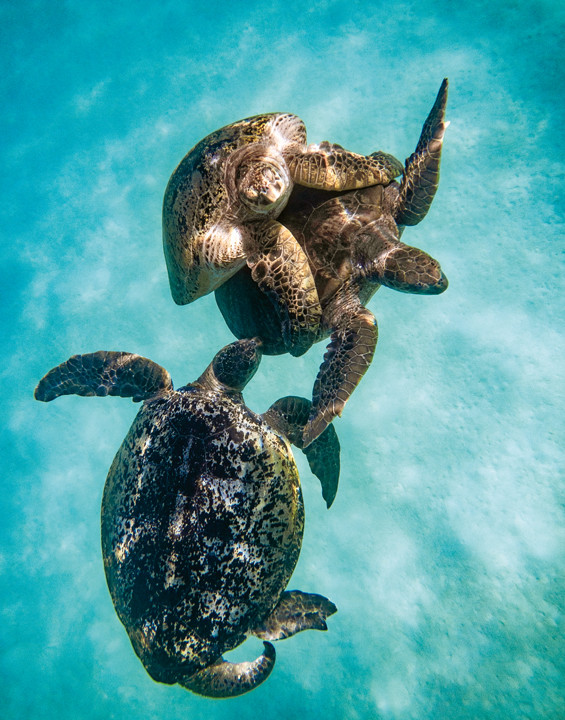 Once we had crossed this frightening trench, we noticed some moving shells on the surface. It wasn’t easy to make out the unidentified floating objects, but as we came closer, two mating turtles appeared in the camera’s viewfinder. It turned out that the atoll was full of them, hundreds of turtles in their reproduction period in crystal clear water.