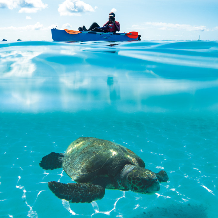 Outside the atoll, scuba diving is possible, to observe dozens of manta rays being cleaned on the sandy shallows. And you can even, with a bit of luck, look into the eyes of a curious hump-backed whale…