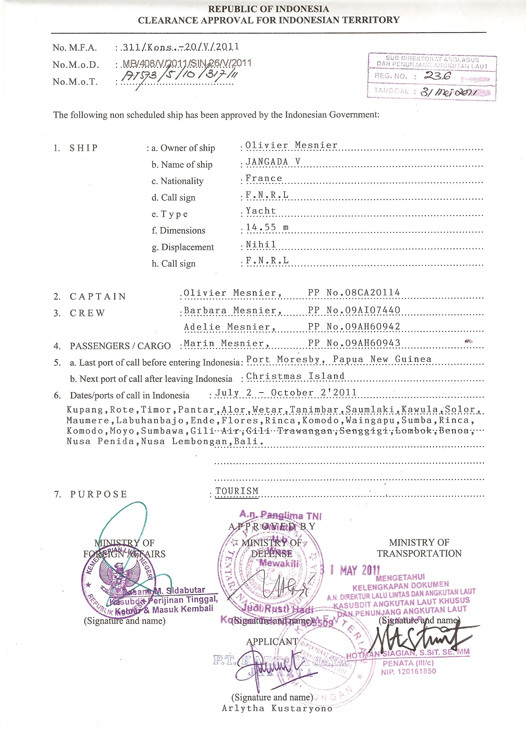 Obviously you need to lay a marker down with Napa right from the start. When I met him for the first time at the Lavallon over my first Bintang (Indonesian beer) he started out by trying to get 100,000 rupees out of me for handing over the original of the C.A.I.T which had been sent by Lytha, his associate in Jakarta. Even though this service had already been paid for by the Western Union money transfer… I burst out laughing, which disarmed Napa somewhat, and I mentioned that he was much talked about on the internet, although I didn’t go into the details. I had also mentioned to him when informing him of our arrival that I would only need him to hand over the C.A.I.T. which would have had him wondering whether I would be going to use him for the other services… Napa was therefore worried that I would go to his rival, which I thought could be a good thing. He also shouted at me for not having warned him of our exact arrival time in the bay. This meant that he would have probably had to pay some of his henchmen a few hundred rupees to keep an eye out for us. So in this case, Napa had to be happy with the minimum union rate for a corrupter, as I had taken the initiative in the negotiation. And with the laugh of a sailor who was used to port bars, I gave him a great big friendly slap on the back: he understood that there wouldn’t be any supplement for the C.A.I.T and I managed to negotiate a price of 100 Australian dollars for the other services, which was a good price given that many people often paid double. Napa tried to convince me that I was paying a pittance and that there would be nothing left for him. I was slightly apprehensive handing the original of the ship’s license and our four passports over to him, but there was no alternative. Everything was alright though, and I recuperated the stamped documents the next day at the Lavalon over a ginger tea…