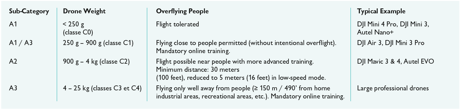• This European framework classifies drones into three categories according to the level of risk associated with their flights: