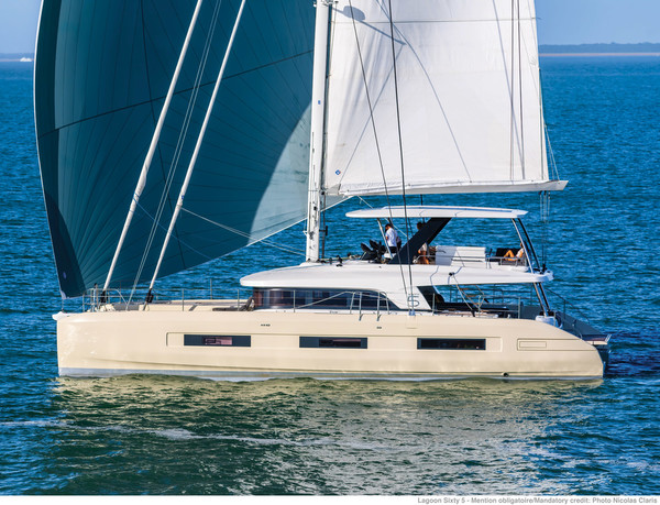We had hoped to see her in April at the International Multihull Show... but it’s going to be at Cannes in September, if all goes well. The launch of the Lagoon SIXTY 5 has of course been disrupted by the health crisis. While waiting for the 2020 Cannes Yachting Festival, here we are aboard this imposing catamaran of more than 65 feet (20 meters). For once, the base of this model is the power version and not the other way round. Lagoon was eager to first complete its power model in this fast- growing niche market. The SIXTY 5 is therefore the sailing version of the SIXTY 7 first presented barely a year ago - see our test in MW170. This new boat is based on the design of the big Lagoons and keeps the suspended deckhouse and the “ear” cut out at the top of the aft pillars. The burgundy red hulls of the first model have given way to a more discreet cream. But the most visible difference is of course the imposing rig. On the other hand, the work carried out on the aft third of the hulls, rudders and keels - the draft is 16” (40 cm) deeper - is obviously more discreet.