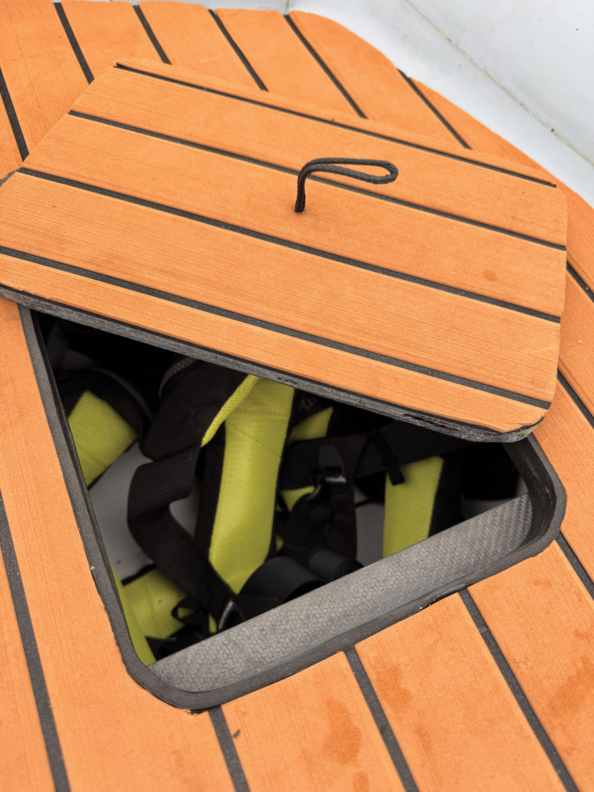 18-inch (45 cm) tubes effectively raise the freeboard. We really liked the incredible stability of this tender – it’s like a pontoon! We also applaud the comfortable seating and the softness of the added cockpit lining. It should be noted that the cockpit is self-draining. There’s plenty of storage space and fabric bags. Four anchor points are provided for hoisting the tender on the davits. The fuel tank and battery are stowed in the bow - a messenger line is supplied for connecting the fuel pipe and cables under the floor. At full throttle with three people on board, the AXCat 350 can reach 16 knots, but as it planes very flat due to its large aft volume, it requires a long-shaft motor. In tight turns, the engine tends to cause heel on the inside of the turn... but not the catamaran hull, which prefers to take a little edge and bite on the outside. Sharp turns are therefore felt a little harshly by the crew, but a high-speed slalom exercise is not at all part of the AXCat’s program.