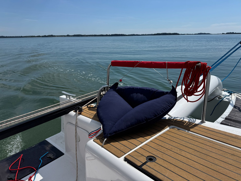 For the second test, I took the cushions aboard the Tricat 8.50, and it was on this small trimaran (inevitably more rustic in terms of comfort than the New 41, which is already equipped with multiple seats) that the Hømer cushions really came into their own. François-Xavier, who had spent several long hours at the helm a few days earlier, sitting on the hard deck, immediately adopted the cushions. Attached to the lifelines for perfect positioning when sailing close-hauled or shared in the cockpit when at anchor, the two cushions were in use throughout the afternoon. The soft comfort of the Hømer cushions appealed so much to the Tricat skipper that he kept them both!