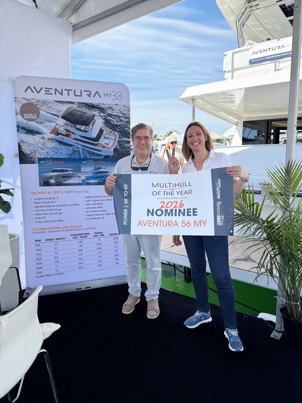 After a particularly smooth and efficient shuttle transfer — worth mentioning, as that hasn’t always been the case in Miami — I headed to Collins Avenue to explore the power multihulls. Unfortunately, they are neither numerous nor grouped together in this section of the show, meaning a fair amount of walking is required. Still, the visit was worthwhile, with the new Aventura 38 MY, the TH33 now showcased on the Jeanneau stand, and a refreshed Leopard 53PC (videos coming soon). While the selection of powercats on Collins remains limited, major players such as Aquila, Sunreef, YOT, Prestige, Canados, Moon Yacht, and Wama were also on display.