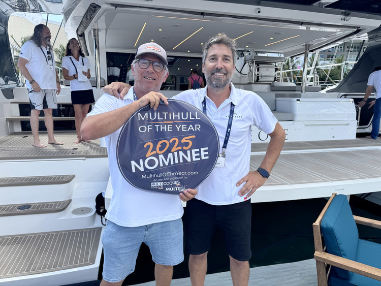On February 12, opening day of the Miami International Boat Show, we unveiled the list of 25 yachts selected for MOTY 2025. Many of the nominated builders (and their multihulls!) were in attendance at the Miami event, meaning we were able to provide them with stickers and/or banners on the spot!